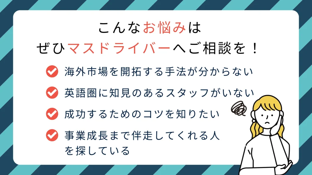 もし、多くの課題をクリアして海外市場での成功を目指している場合は、海外事業展開に長けたマスドライバーまでご相談ください。最新の検索アルゴリズム分析で戦略立案を最適化し、迅速かつ柔軟な対応が可能です。