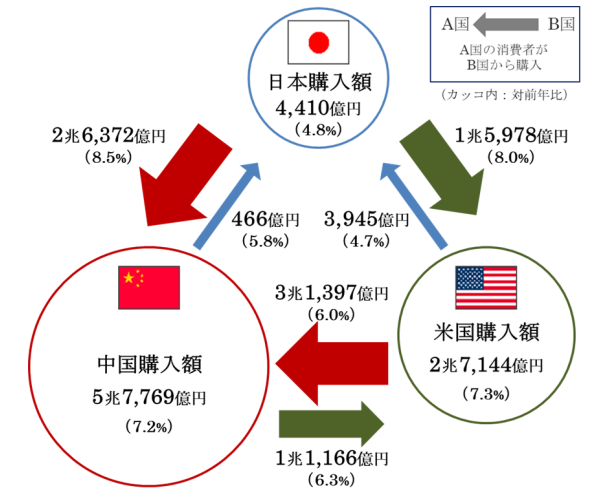 3位の英国(3.6%)や4位の日本(2.8%)を大きく引き離す規模であり、中国とアメリカの2カ国だけでEC市場全体の約7割を占める状態です。